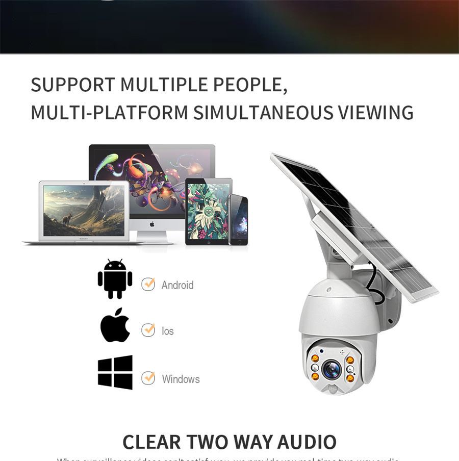 3. Audio 2 voies et détection de mouvement PIR précise ---4g étanche à l’extérieur Caméra solaire intégrée spearker et microphone vous permet de parler à distance avec des personnes qui se trouvent dans la zone de surveillance. La caméra solaire extérieure étanche 4g adopte un capteur de mouvement PIR numérique très sensible et un détecteur de radar, envoyez des alertes à votre téléphone après avoir détecté des mouvements de personnes. avec une technologie d’analyse de pixels précise, réduisant au maximum les fausses alarmes causées par la pluie et les insectes.